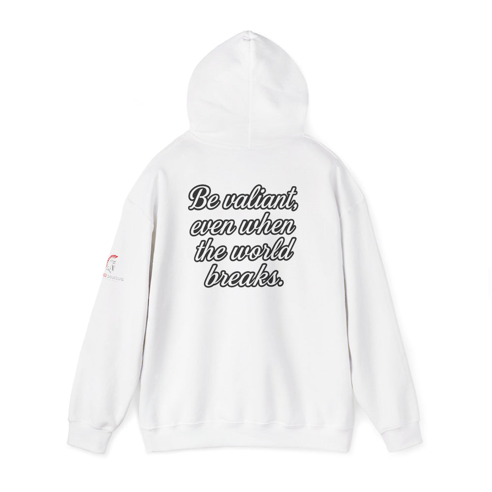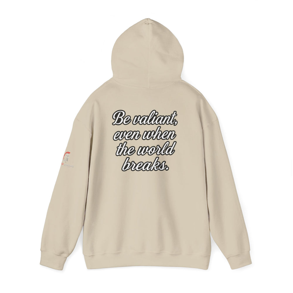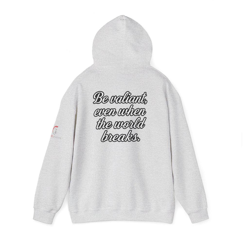 This elegantly powerful design delivers a profound message about maintaining warrior courage when everything around you is falling apart, reminding us that true valor is tested in our darkest hours. This hoodie represents the understanding that anyone can be brave when things are going well—true valor is revealed when the world is crumbling around you. It's about standing firm when foundations shake, staying strong when systems fail, and maintaining hope when everything seems hopeless. Made with a thick blend of cotton and polyester, it feels plush, soft and warm, a perfect choice for any cold day. In the front, the spacious kangaroo pocket adds daily practicality while the hood's drawstring is the same color as the base sweater for extra style points.