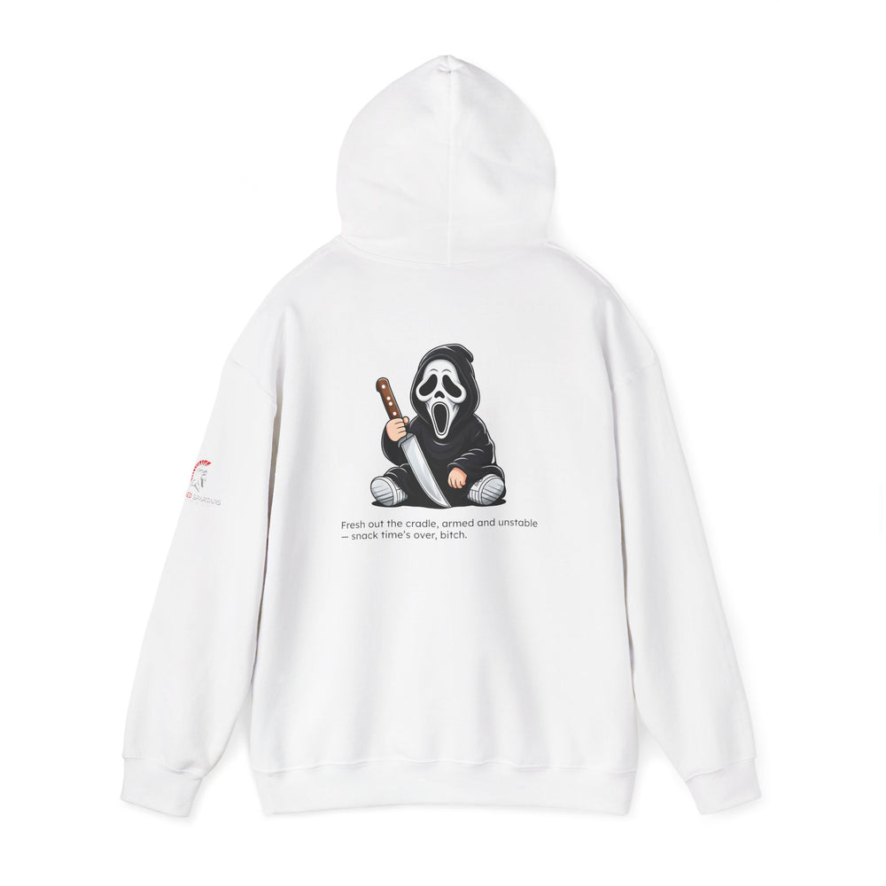 Introducing a stylish and comfortable Hooded Sweatshirt that embodies both coziness and personality. This edgy, dark humor hoodie combines horror movie iconography with childhood imagery to create a bold statement piece for those who appreciate twisted comedy and aren't afraid to push boundaries. Perfect for those chilly evenings or casual hangouts, this sweatshirt features a classic fit with a soft, medium-heavy fabric that feels like a warm embrace. The eye-catching designs, with unique prints on the sleeves and back, make it a standout piece in any wardrobe. Ideal for young adults and trendsetters, it’s perfect for celebrations like Halloween. With its spacious kangaroo pocket, it’s designed to be practical and fashionable, blending seamlessly into everyday life.